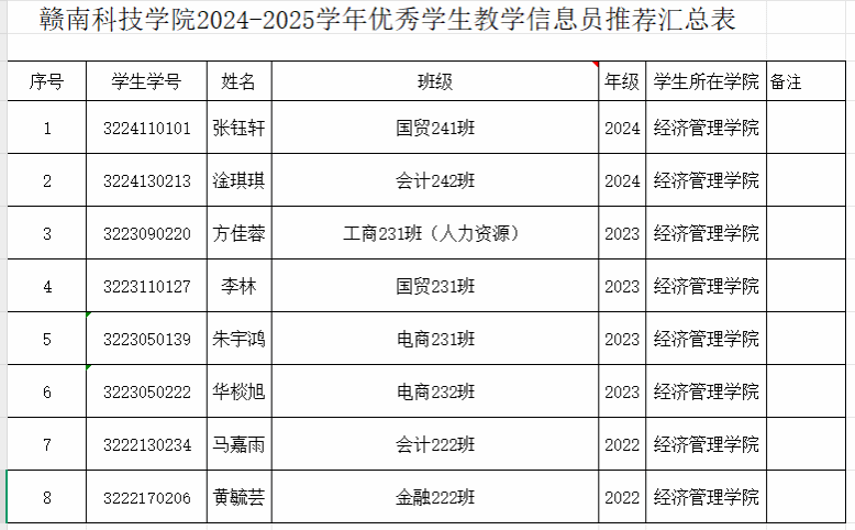 根据《赣科院教字(2024)4号关于印发《赣南科技学院教学信息员制度(试行)》的通知》要求,经学生个人申请、学院审核等程序,拟推荐国贸241班张钰轩等8位同学为优秀学生教学信息员初评人选,现将初评人选的相关情况公示如下(按年级学号排序):