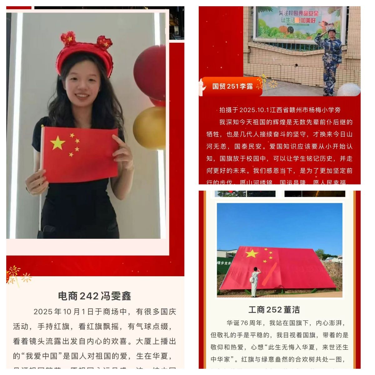 同时,学院还举办了“铸盾强国路,逐梦新征程——我与祖国共76载”国庆征文大赛,学生们用文字表达对祖国的热爱和对未来的憧憬;“10・1同框国旗,共绘心中家园”与国旗合影活动也吸引了众多学生参与,鼓励学生在所在地寻找“国旗元素”,并配上“对祖国的祝福语”或“我的国庆心愿”,记录下这一美好时刻。