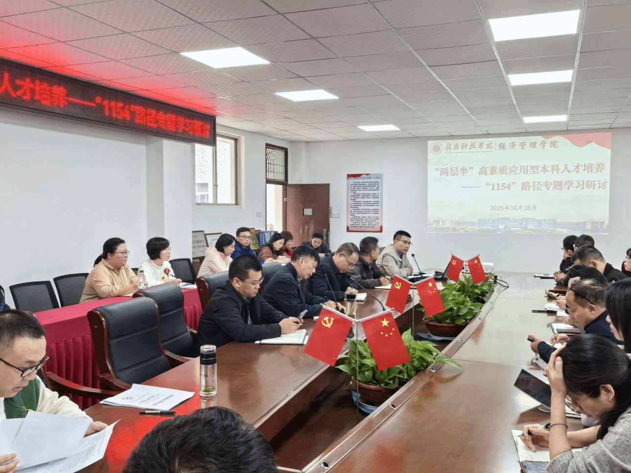 本网讯:2025年10月28日下午,经济管理学院召开“两层半”高素质应用型本科人才培养—“1154”路径专题学习研讨会。学院领导班子成员、全体专任教师全员参与,会议由学院党委委员、教学负责人王波主持。