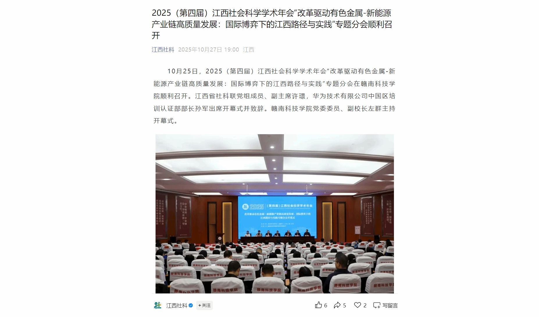 10月25日,2025(第四届)江西社会科学学术年会“改革驱动有色金属-新能源产业链高质量发展:国际博弈下的江西路径与实践”专题分会在赣南科技学院顺利召开。江西省社科联党组成员、副主席许璟,华为技术有限公司中国区培训认证部部长孙军出席开幕式并致辞。赣南科技学院党委委员、副校长左群主持开幕式。