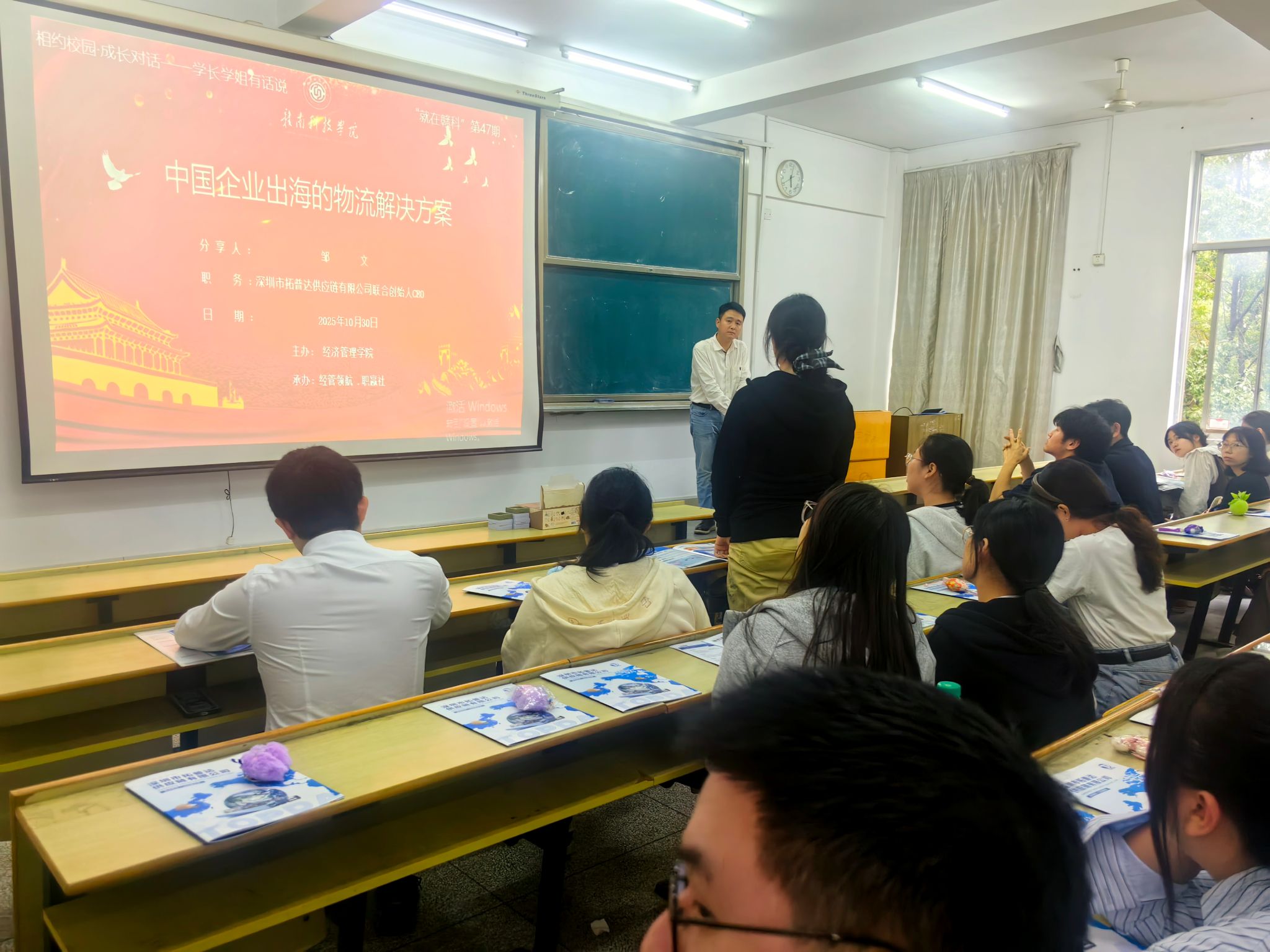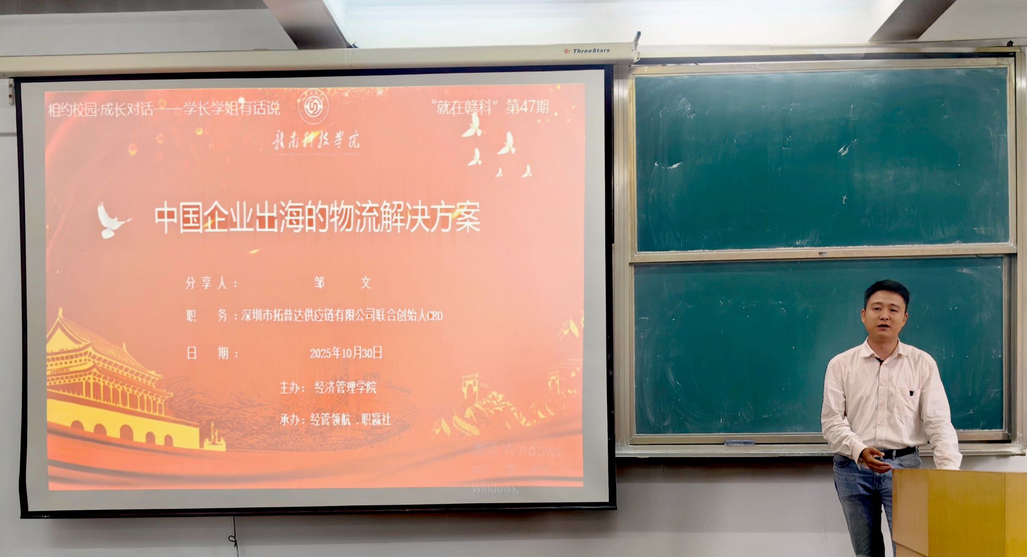 10月30日下午,经济管理学院特邀2009届国际经济与贸易专业校友、深圳市拓普达供应链有限公司联合创始人邹文在新民楼2303教室以“中国企业出海的物流解决方案”为题作分享讲座。此次讲座由经济管理学院“经管领航、职赢社”校级职业规划与就业指导工作室承办,是我校“就在赣科”就业育人大讲坛第47场活动,60余名同学参加。