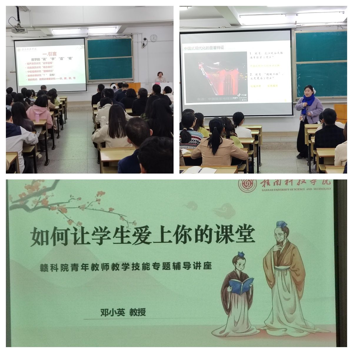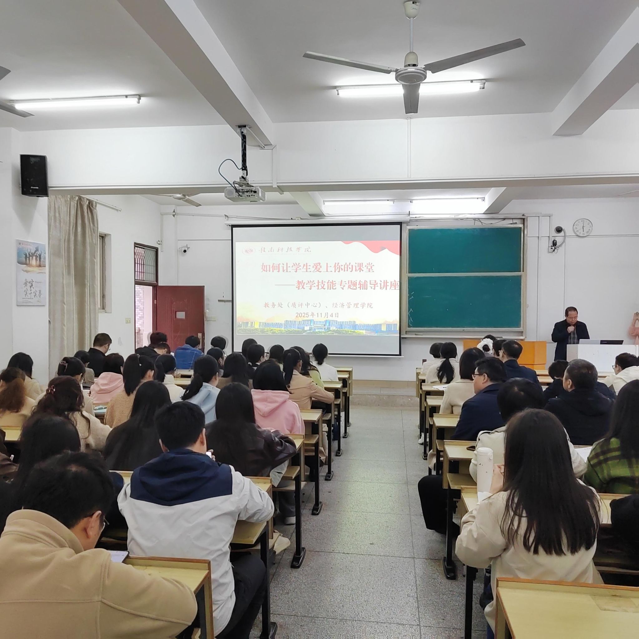 本网讯:为落实本科教学质量持续提升要求,切实增强青年教师职业责任心与教学技能,11月4日下午,由教务处(质评中心)组织、经济管理学院承办的“如何让学生爱上你的课堂”教学技能专题辅导讲座,在新民楼(2 栋)202多媒体教室顺利举行。讲座邀请了校级专职教学督导邓小英教授和江西省高校思政课和红色文化课程教学比赛一等奖获得者许婷婷两名教师主讲,全校100多名近两年新入职青年教师参会,讲座由经济管理学院党委委员、副院长钟滨主持。