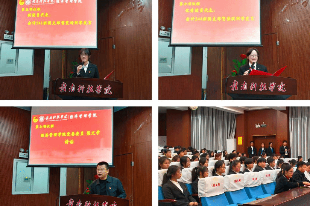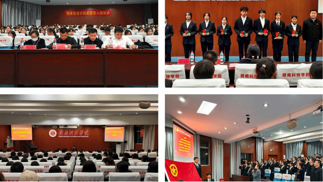 本网讯:经济管理学院于11月20日在新民楼报告厅举行2025新发展团员入团仪式。学院党委委员梁文学、学院团委负责人邹雄刚及24级辅导员刘芳、温良出席会议,各团支部团干代表、新团员共同参与此次活动。会议由学院团委老师王诗琪主持。