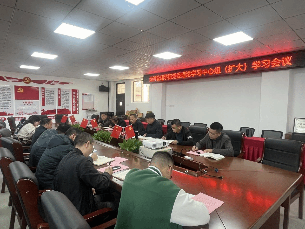 本网讯:11月25日下午,经济管理学院在新民楼305党员活动室召开党委理论学习中心组(扩大)学习会议,深入学习贯彻党的二十届四中全会精神。学院党委书记肖永鸿主持并讲话,学院党委委员、副院长钟滨,学院党委委员梁文学、葛志财、王波参加会议,结合学习内容与分管工作依次开展研讨交流。学校党委委员、纪委书记陈文新到会旁听指导,各党支部书记、教研室主任列席会议。