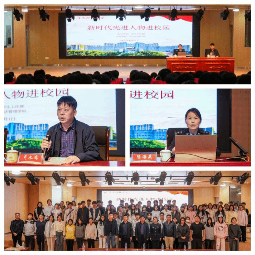 本网讯:引导青年学子从新时代先进人物身上汲取安全防护智慧与责任担当精神,共同维护校园平安建设。12月1日晚,由学生工作部(处)主办,经济管理学院承办的“新时代先进人物进校园”专题讲座于大学生活动中心报告厅举办。讲座邀请赣州市公安局刑警支队刑事技术大队大队长陈海英警官开展“无声证言铸忠诚 科技赋能护平安”报告会,学生工作部副部长(副处长)黄敬宝及全校300余名师生聆听了此次事迹报告会。讲座由经济管理学院党委书记肖永鸿主持。