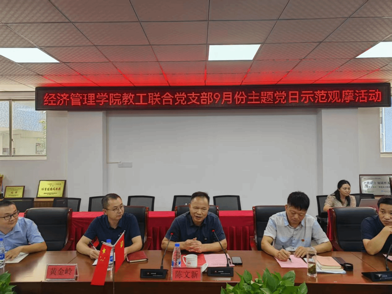 本网讯:为深入学习贯彻习近平总书记重要讲话精神,大力弘扬教育家精神,强化教师队伍建设,9月28日上午,经管学院教工第一、第二党支部在学院305会议室联合开展了“以教育家精神强师铸魂,谱写教育强国建设华章”为主题的主题党日示范观摩活动。赣南科技学院党委委员、纪委书记陈文新出席活动,学校相关职能部门及各二级学院观摩同志,经济管理学院教工第一、第二党支部全体党员共同参与,活动由学院教工第一党支部书记黄金岭主持。