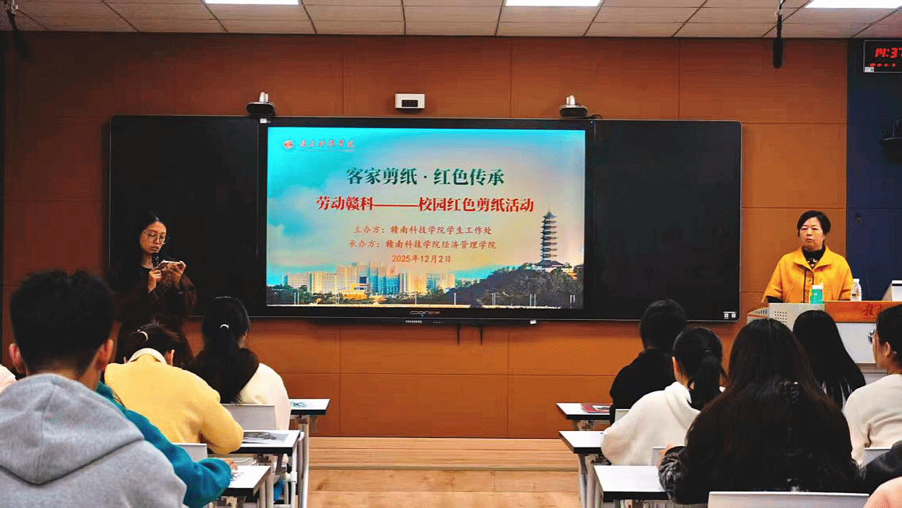 本网讯:为弘扬中华优秀传统文化,推动非物质文化遗产在校园内的传承与发展,丰富学生的课余文化生活。11月26日,由学生工作处主办,经济管理学院承办的“劳动赣科——客家剪纸·红色传承”校园红色剪纸活动在崇善楼628教室举办。此次活动特别邀请了赣南客家剪纸市级非遗代表性传承人曾晓梅进行讲授与指导,40余名学生参与此次活动。活动由经济管理学院辅导员王诗琪主持。